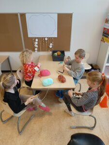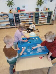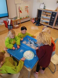 Er liggen ijsbrokken op het plein en kijk, het smelt als je het vastpakt! We spelen met ijs in de klas, daar smelt het nog harder. We ‘breien’ een sjaal voor onze knuffels.