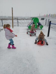 Overal ligt sneeuw de kinderen komen met de slee naar school! We spelen met de sneeuw op het plein. We meten met de thermometer hoe koud het is buiten en binnen!